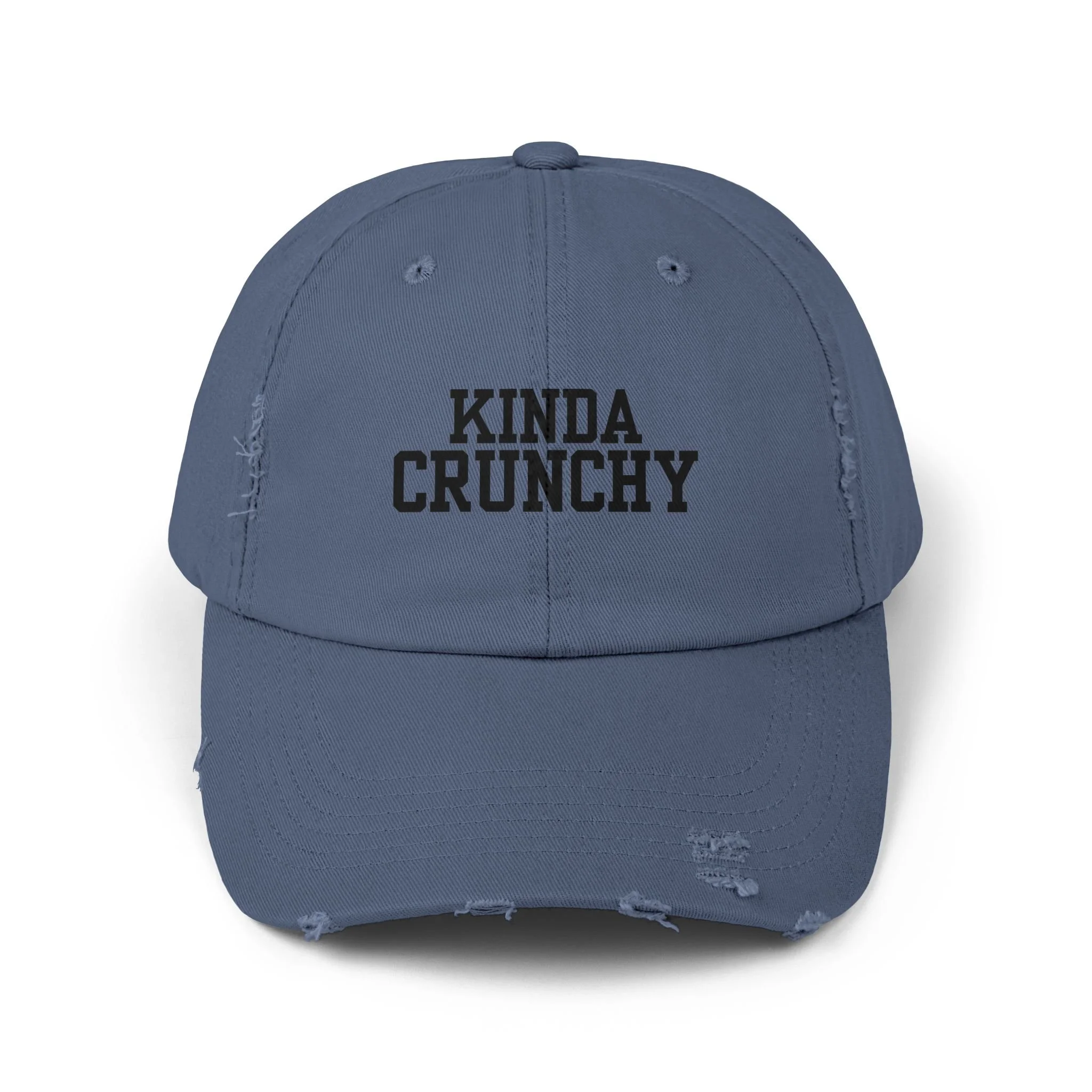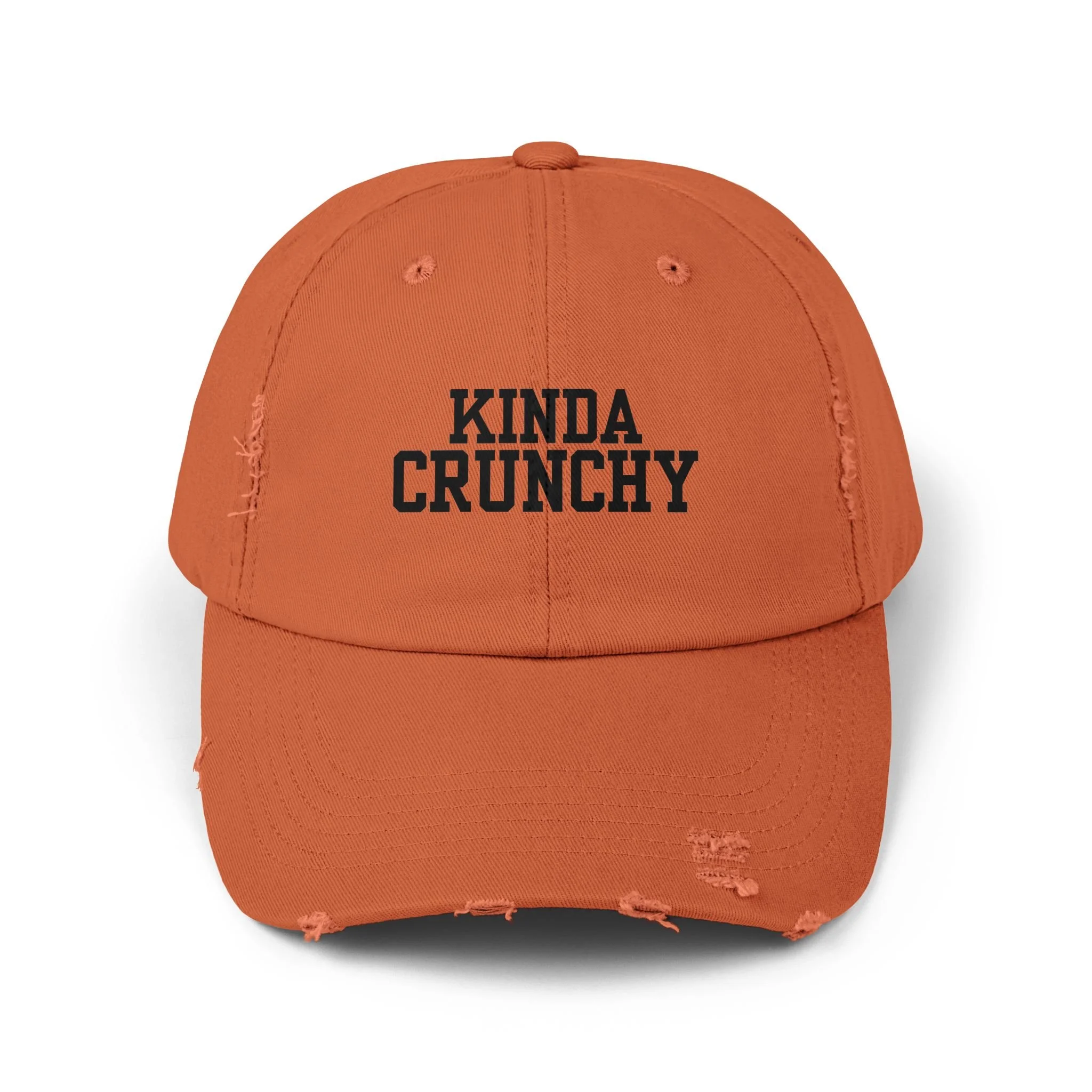 This distressed cotton cap carries an easygoing, lived-in vibe — soft, slightly faded fabric with charming frayed edges and bold, simple lettering that reads “KINDA CRUNCHY.” It sits low and relaxed on the head thanks to an unstructured 6-panel build, curved visor, and comfortable hideaway strap with a metal D-ring for subtle adjustability. The vintage twill and unique distressing give each hat small variations in color and wear, so it feels personal from day one. Wear it to run errands, to morning markets, or layered under a denim jacket for weekend trail walks — it blends into casual, outdoorsy, and conscious wardrobes with quiet confidence.